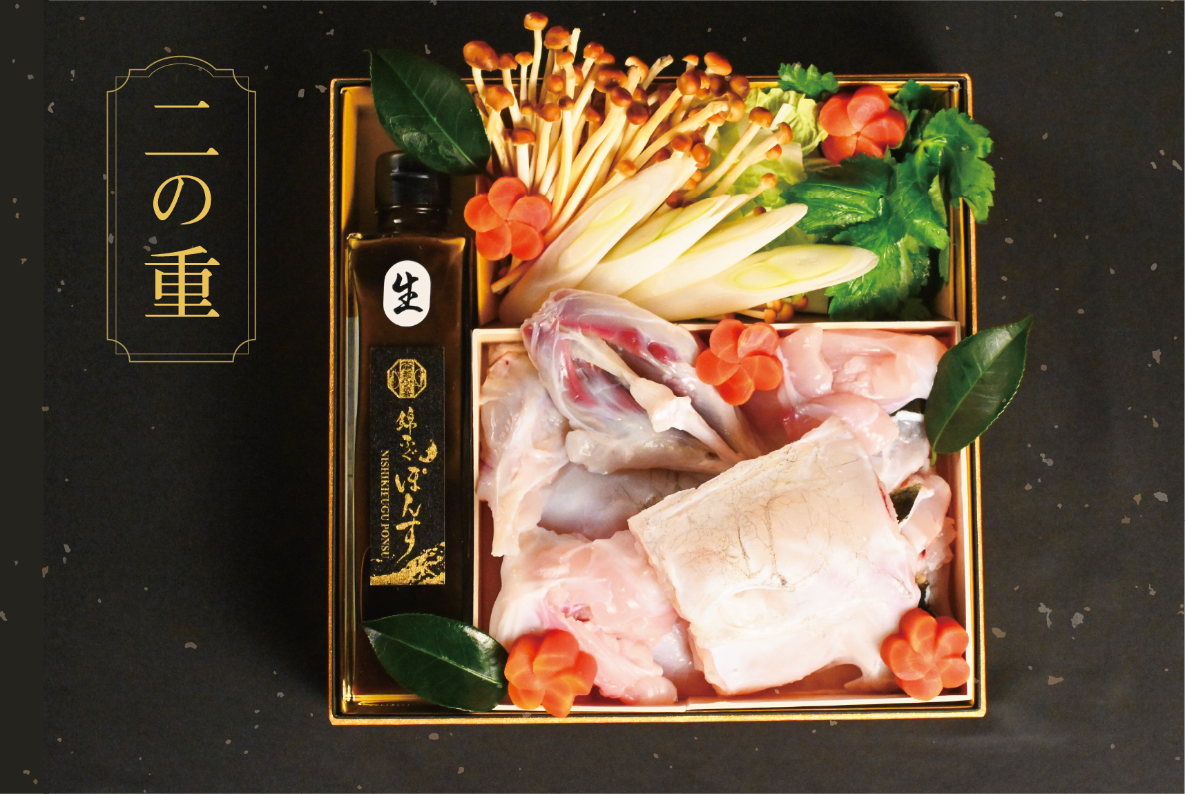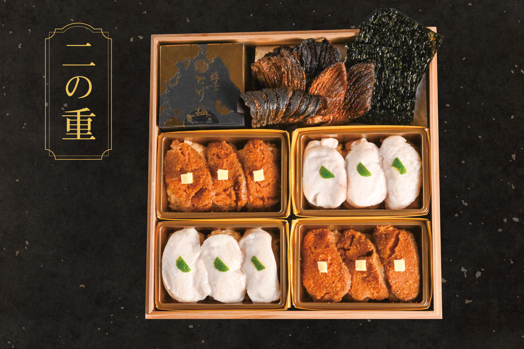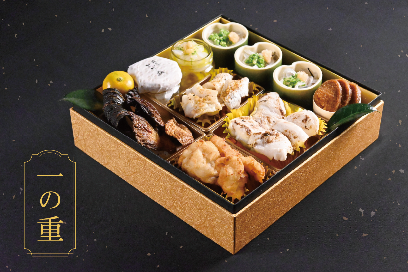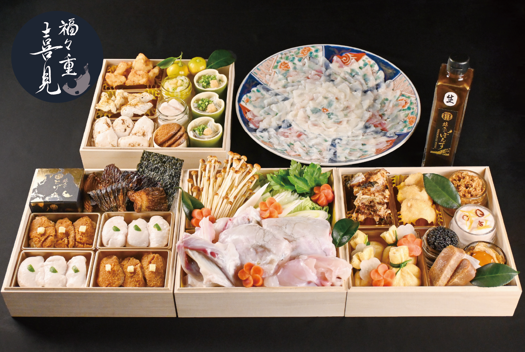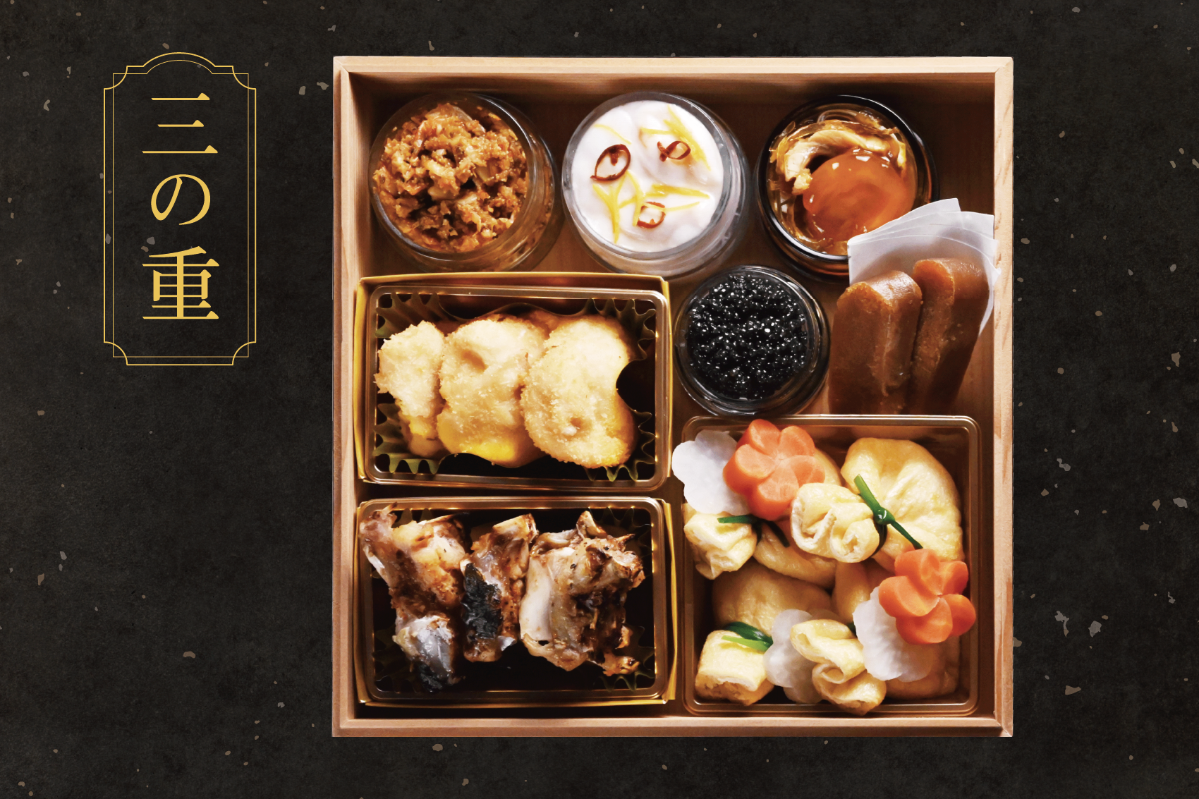 【福々重 喜見】は、『人形町 喜見』のシェフ小髙 見氏による特別な献立の豪華な三段重です。